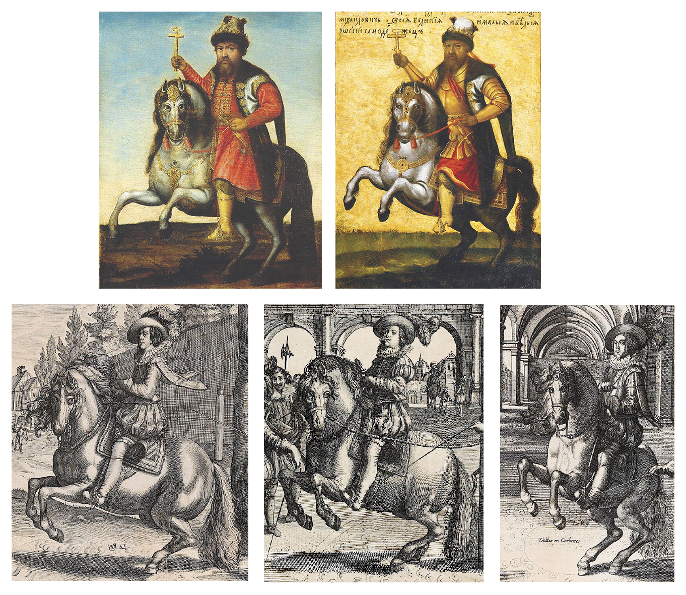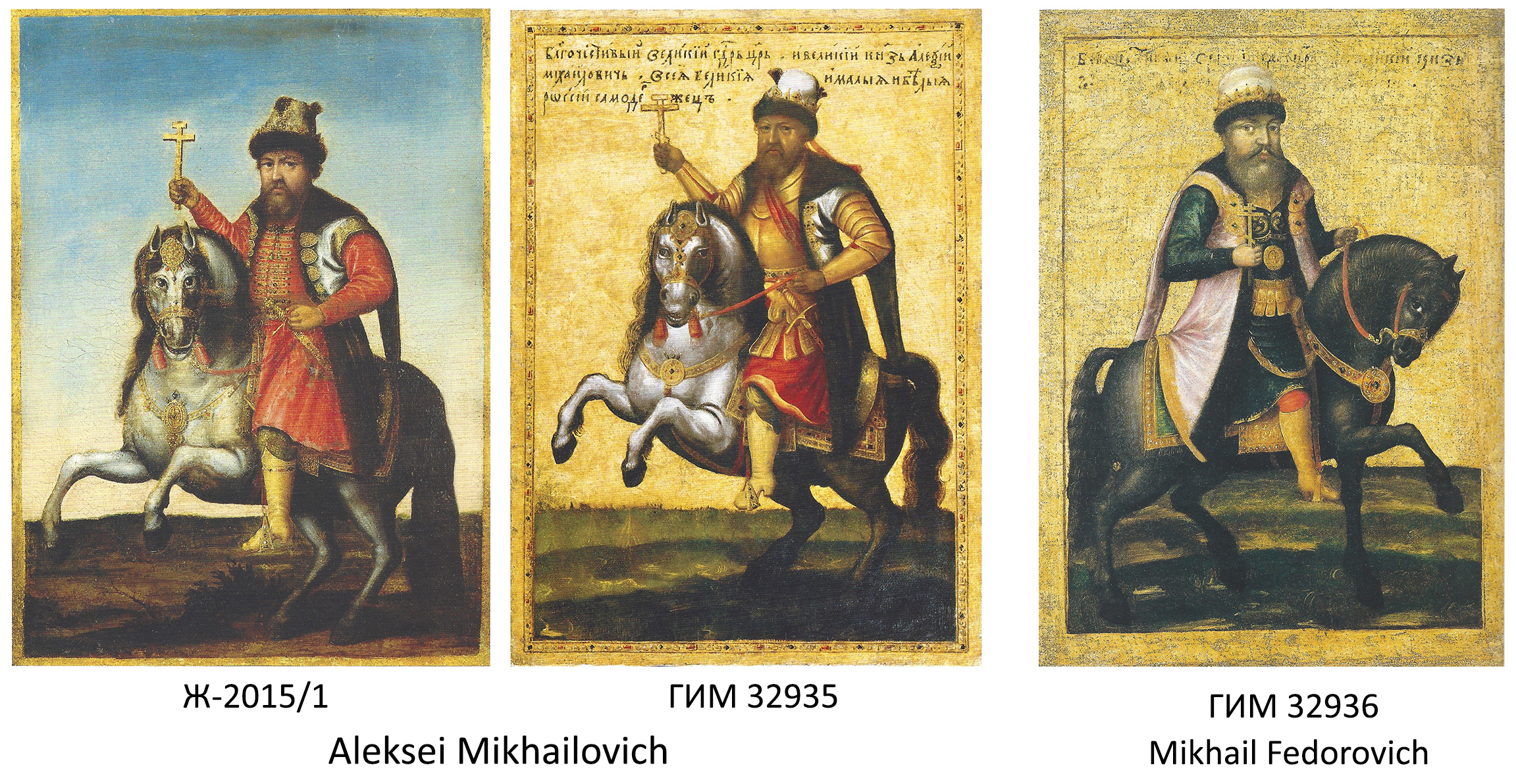 1. Fig. 1. The equestrian images of Tsars Aleksei Mikhailovich and Mikhail Fedorovich in the Moscow collections / Конные портреты царей Алексея Михайловича и Михаила Федоровича, хранящиеся в Московских собраниях. After: [Русский исторический портрет, 2004, с. 124, 122, 121 (№№ 38, 37, 36)]. | |
