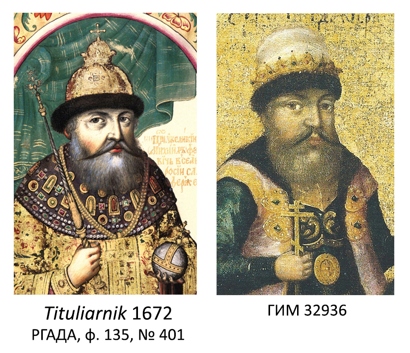 2. Fig. 2. The depictions of Tsar Mikhail Fedorovich in the Tituliarnik of 1672 (RSAAA, f. 135, no. 401) and in the equestrian portrait SHM 32936 / Изображения царя Михаила Федоровича в Титулярнике 1672 г. (РГАДА, ф. 135, № 401) и в конном портрете ГИМ 32936. | |
