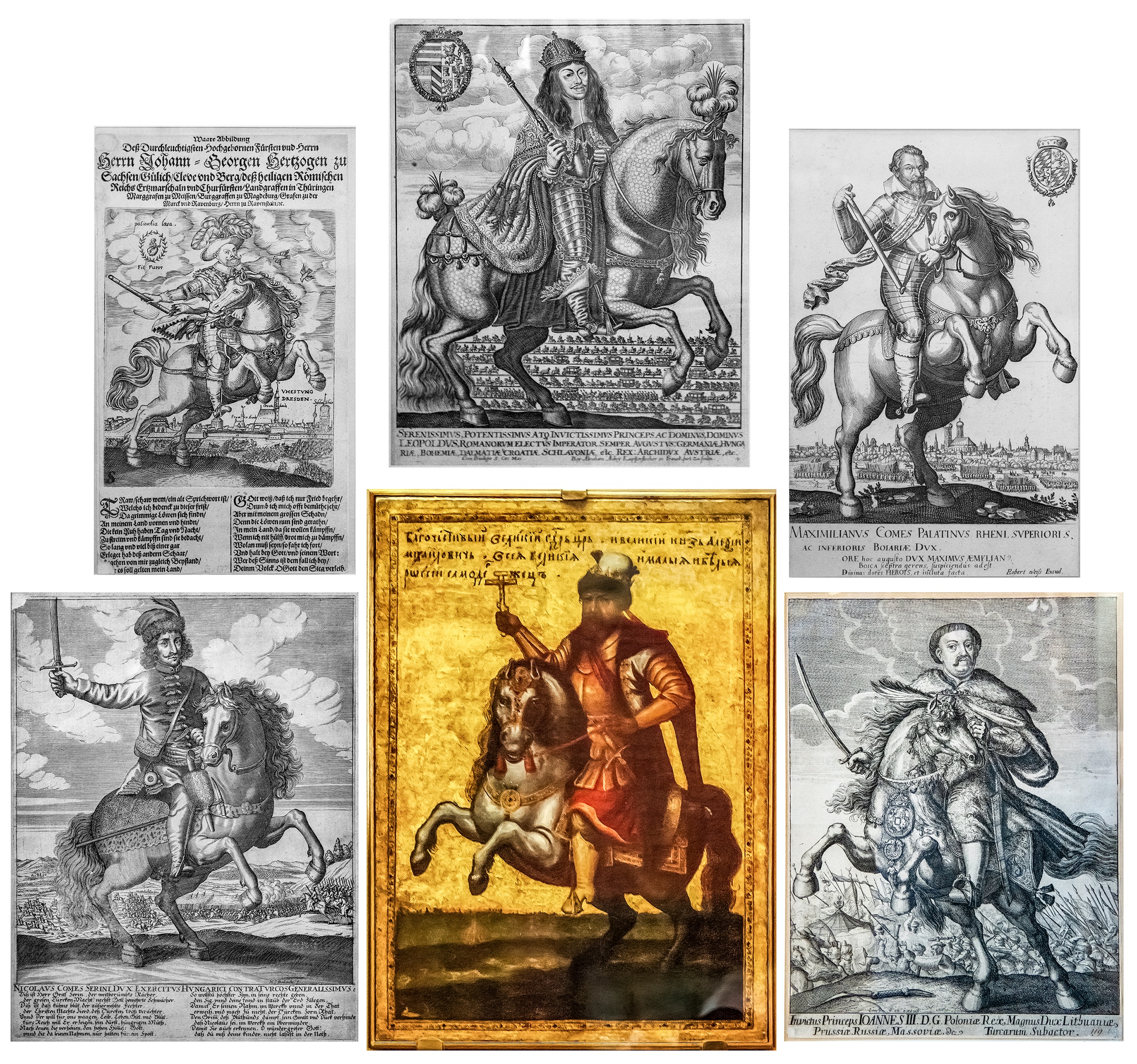 4. Fig. 4. The equestrian portrait of Aleksei Mikhailovich (SHM 32935) compared with engravings depicting his contemporary military and political leaders (clockwise from lower left: Count Nikolaus Zrinyi, Elector Johann Georg I of Saxony, Emperor Leopold I, Elector Maximilian I of Bavaria, King Jan III Sobieski) / Конный портрет царя Алексея Михайловича в сравнении с гравюрами, изображающими современных ему военачальников и политических фигур (по часовой стрелке, с левой стороны внизу: граф Николаус Зрини [Николай Зринский], саксонский курфюрст Йоханн Георг I, император Леопольд I, баварский курфюрст Максимилиан I, польский король Ян III Собеский). | |