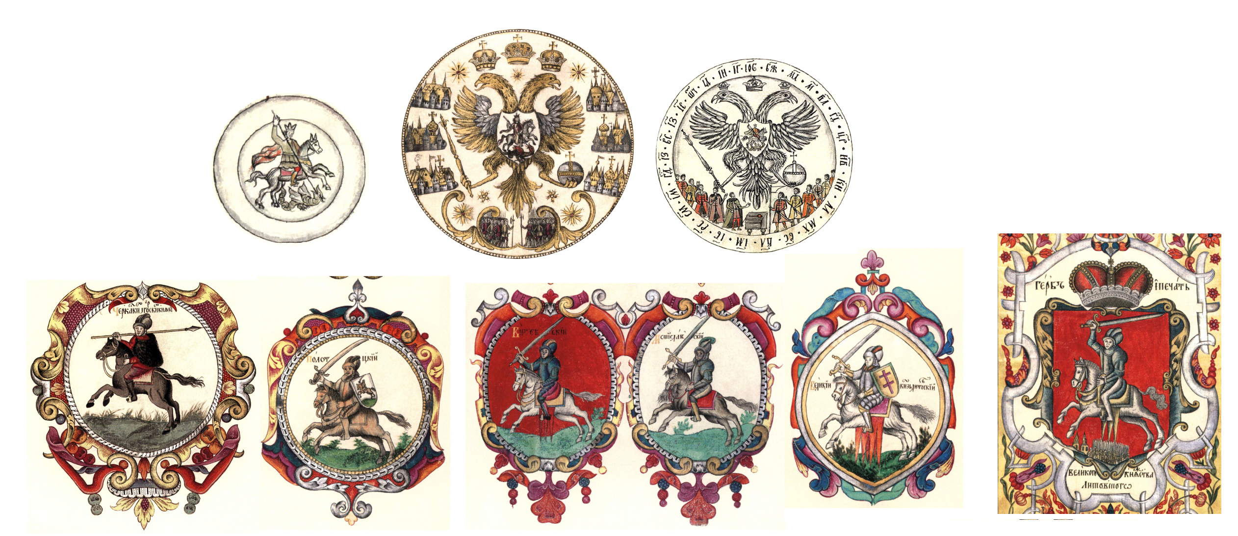 6. Fig. 6. Illustrations in the Tituliarnik of 1672 with depictions of horses on heraldic ‘arms’. In the top row, center, the arms of the Muscovite state, flanked by seals for two of the chanceries. In the bottom row, seals for various regions, the image on the far right the arms of the Grand Principality of Lithuania, and next to it an image for the Grand Prince of Lithuania, bearing a shield with the double cross of the Jagiellonian Dynasty / Иллюстрации гербов, изображающих лошадей, в Титулярнике 1672 г. В верхнем ряду в центре герб Московского государства и по бокам печати двух приказов. Внизу, печати разных областей, включая (крайняя справа) гербы Великого княжества Литовского и великого князя Литовского (рядом), с крестом династии Ягеллонов на щите. | |