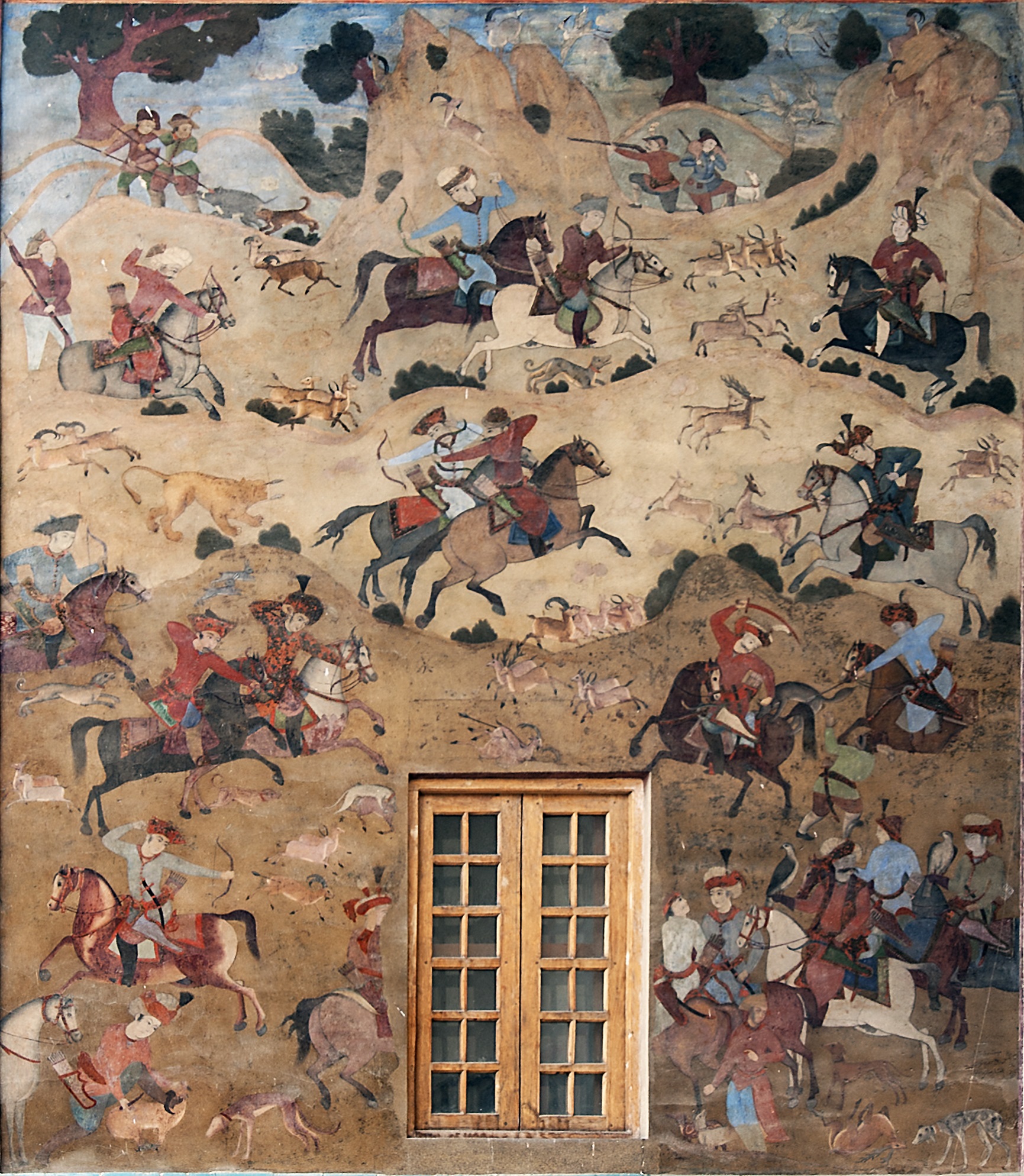 9. Fig. 9. Scenes of the royal hunt painted on the west wall of the Qaysariyyah Gate at one end of the central square (the maidan), Isfahan, early seventeenth century / Изображение королевской охоты на западной стене Кайсарийских ворот на окраине центральной площади (майдан), Исфахан, начало XVII в. Photo: D. Waugh. | |