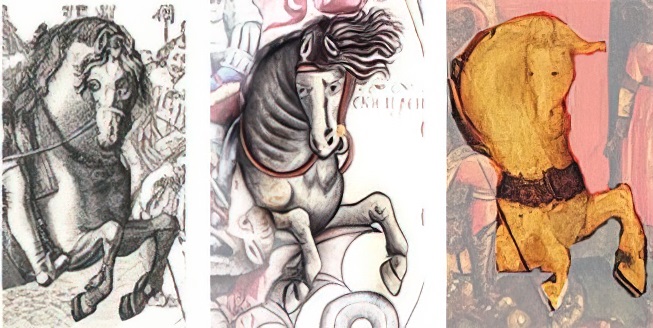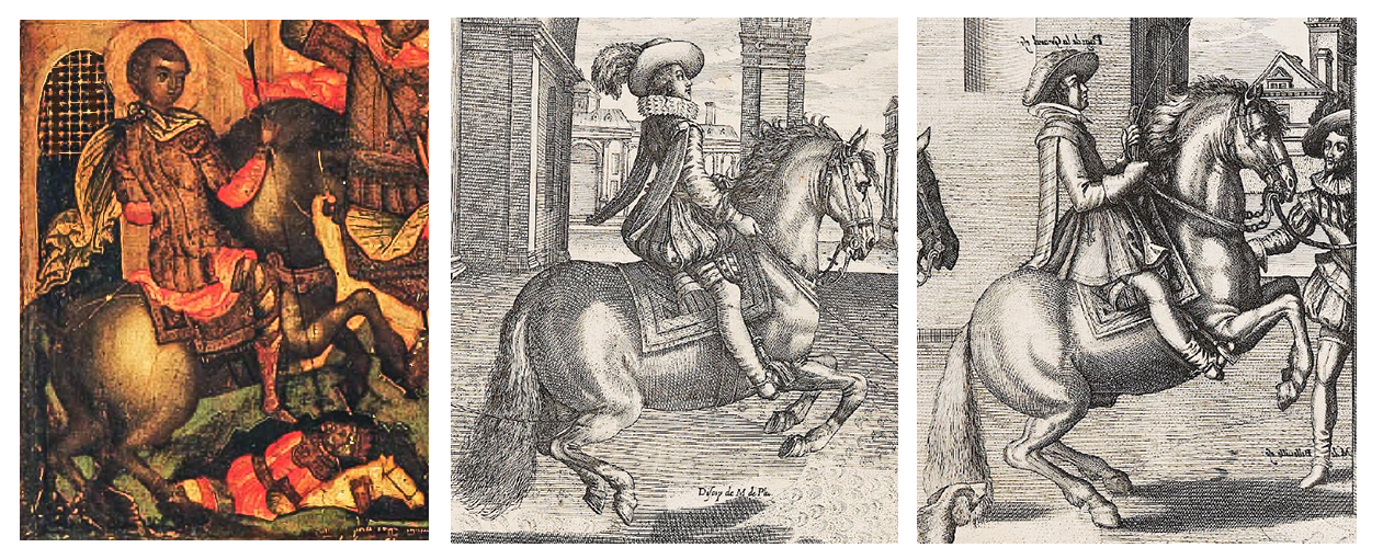 14. Fig. 14. Comparison of Nikita Pavlovets’ icon image of St. Demetrius of Thessaloniki and two of the analogous horse engravings in Pluvinel, ills. 15, 13 (reversed horizontally) / Сравнение изображения св. Дмитрия Солунского на иконе Н. Павловца с гравюрами лошадей в книги Плювинеля (Илл. 15, 13 [размещена горизонтально]). | |
